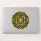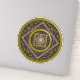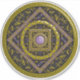 Esta mandala fue diseñada para el símbolo zodiaco, Sagittarius, que representa una piedra amatista en el centro rodeada de elementos que representan el signo, como el símbolo del signo, la constelación y el símbolo alquímico del Fuego, así como las viñas y tejas de filigree que la envuelven en una imagen sólida en tonos violeta, dorado y negro.