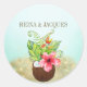 Los sellos para sobres tropicales redondos con nombres y un ramo de flores de hibisco y hojas de palmera florido dentro de un coco sobre la arena dorada brillante le dan un toque final elegante a sus envíos de correo. Ideal para invitaciones y favores de bodas de playa y destino, eventos tropicales y luau temáticos, o sólo para envíos diarios.