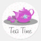 Sello para sobres de fiesta de té divertido hecho con fondo de punto de polka blanco y rosa. Gráficos vectoriales personalizados de un recipiente de té rosado y tazas decoran el pegatina y el texto debajo de lecturas, Tiempo de té. Personalice el texto para leer lo que desee. Una forma divertida de terminar tus invitaciones a la fiesta del té, o como etiquetas para los tés hechos en casa.