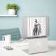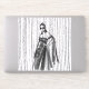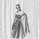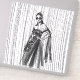 Un ilustracion de diseño en blanco y negro con una mujer encapuchada y un vestido de flores intrincadas con adornos florales y una capa que fluye. El fondo tiene una sorprendente textura vertical de línea, añadiendo un sentido de profundidad y movimiento