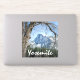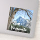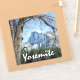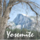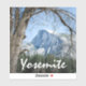 Texto "Yosemite" en una foto de Media Cúpula de Yosemite. Una hermosa montaña de granito refleja el azul del cielo. Enmarcado por un árbol elegante, este es el icónico Half Dome de Yosemite. Perfecto recuerdo de una visita al Parque Nacional Yosemite.