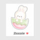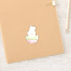 Agradable y divertido pegatina de vinilo de Pascua con conejo blanco sentado en un huevo rosa y verde de Pascua.