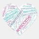 Un diseño de bienvenida en forma de corazón que da la bienvenida a más de 60 idiomas diferentes. La imagen está disponible para una variedad de productos. La adición de texto es opcional.