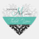 Favor de la boda turquesa en forma de corazón, verde, negro y blanco Damasco Gracias Pegatinas personalizados con Monograma. nombres iniciales y de novios. Por Elke Clarke ©. Una manera elegante de etiquetar tus favores de boda. ¿Necesita una combinación de colores diferente? Contáctenos. Más diseños en http://www.luxuryweddinginvites.com. Gráficos con licencia comercial.