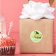 Pegatina con un pedazo sonriente de tostada del aguacate con los aguacates detrás de él. El texto puede ser modificado para requisitos particulares.