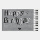 El FELIZ CUMPLEAÑOS de las palabras en letras blancos y negros plásticas. Los corazones del amor y las notas de la música están alrededor de las letras. El fondo es gris con una hoja de la música que se descolora suavemente detrás de él. Las llaves del piano corren abajo del derecho de la imagen.