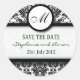Pegatina de boda de monograma de damasco blanco y negro que puede utilizarse como sello de invitación.