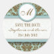 Pegatina de boda en monograma de damasco marrón y azul que puede utilizarse como sello de invitación.