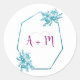 Añada un toque personal y elegante a su boda con este pegatina redondo con las iniciales de la novia y el novio enmarcado por vibrantes flores azules del océano. Un sutil corazón gris claro detrás del monograma añade un detalle romántico. Perfecto para sellar sobres, decorar favores o personalizar papel boda. Completamente personalizable, este pegatina complementa los temas de bodas en la playa, la costa y el destino con su estilo floral fresco y moderno.