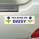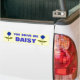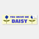 Esta brillante pegatina del parachoques presenta dos imágenes digitales de una margarita con un tallo verde con dos hojas verdes sobre ella y pétalos de color azul claro y oscuro con un centro azul claro. El fondo es amarillo sol y el texto azul brillante dice, me conduces margarita.
