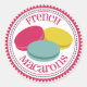 Pegatina de sello para sobres con un ilustracion de tres macarones franceses (rosa, azul y amarillo) dentro de un círculo decorativo rosa y azul con texto rosa.