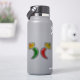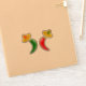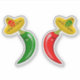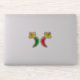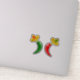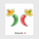 Esta asombrosa hoja de pegatina en forma de hojalata tiene un par de hilos, un chile rojo y un chile verde. Ambos tienen ojos negros y bocas rosas. Cada chile lleva un gorra con sombrero que tiene un cráneo de color opuesto al ají en celebración del Día de los Muertos en México, Día de los Muertos. El sombrero también contiene tres flores con pétalos rojos y verdes alternados que representan la bandera de México.