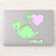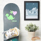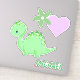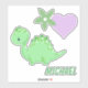 Un lindo y verde bebé dinosaurio es la característica pegatina en este adorable conjunto. Junto con los dinosaurios hay una flor verde y un corazón rosado. El nombre de su hijo está en verde coincidente en un pegatina independiente.