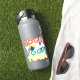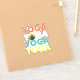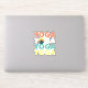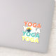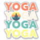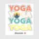 Diseño de texto de color gris estilo retro "Yoga, Yoga, Yoga, Yoga" con un chica en yoga posando sobre colorido estilo retro a rayas