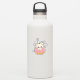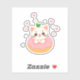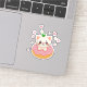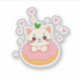 Gato Kawaii sentado en una dona glaseada rosa con una pequeña hoja, sonriendo con mejillas sonrosadas, rodeado de estrellas y corazones.