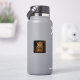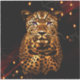 Eclipse Majesty, exhibe un leopardo con piel dorada brillante y puntos distintivos, ambientados en un fondo oscuro. Los ojos del leopardo están iluminados con un color violeta brillante, lo que crea un efecto místico y sorprendente. El entorno oscuro se ve acentuado por unas luces dispersas y cálidas que le confieren al lugar una atmósfera dramática casi de otro mundo.