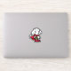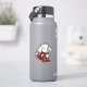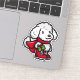 Un caniche blanco con una bufanda roja y botas sostiene un regalo de Navidad verde y rojo.