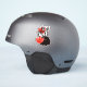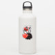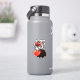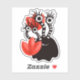 Pegatina lindo del monstruo con una criatura negra del dibujo animado con cuatro ojos en troncos rayados blancos y negros largos que sonríe, ocultada en tulipanes rojos abstractos.