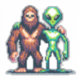 Sásquatch de pie de púxel de 8 bits y alienígena extraterrestre siendo amigos en una resolución de vibración de juego.