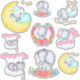 Hoja de 9 pegatinas de vinilo con diseños de elefantes para bebés. Todos estos son ilustraciones acuáticos y perfectos para una niñera o un dormitorio para niñas, juguetes decorativos, botellas de agua, revistas, etc. (Los pegatinas de vinilo son impermeables y extraíbles). Los diseños muestran un elefante de niña con orejas rosas sobre nubes blancas onduladas, rodeado de corazones de amor rosados y globos con forma de corazón. También está sentada en un colorido parche de flores y asomando a través de una colorida corona floral. Finalmente, hay elefantes bebés con orejas grises durmiendo en la luna y atrapando estrellas en caída en un paraguas. Estos diseños también están disponibles de forma individual con plantillas de nombres que puede personalizar.