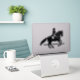 Una calcomanía de vinilo con un ilustracion en blanco y negro de un jinete vestido de forma formal. El caballo y el jinete están tocando una hermosa pirueta. Un elegante movimiento de vestimenta clásica.