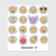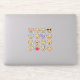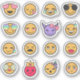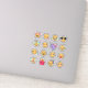 Una hoja pegatina de dieciséis emojis súper lindas, como una emoji de ojos cardíacos, una emoji que sopla un beso, una emoji nerd con grandes gafas redondas y pecas, una emoji fresca de gafas de sol, una emoji malva con un arco rosado y más.