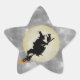Silueta de bruja sobre un palo de escoba con fuego saliendo de la escoba y un gato negro encaramado sobre la manija contra una luna llena redonda.