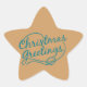 Los Navidades de Navidad saludan a los pegatinas estrellas de vacaciones con un fondo de bronceado con un elegante texto azul que lee los saludos de Navidad. Este clásico y moderno pegatina de vacaciones en forma de estrella concuerda con nuestras tarjetas de fotos, franqueo y etiquetas de direcciones de la Navidad Holly Jolly Jolly Joy.