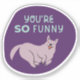 ¡Eres tan gracioso! Sí, tu perro te está juzgando, pero de la mejor manera. Tu perro cree que tienes el mejor sentido del humor. Celebra tu vínculo con tu perro o envía a este pegatina a un amigo con un perro. Esta forma de pegatina con temática de perro y su paleta de colores retro son una versión moderna de mediados de siglo. El color de fondo es violeta, con letras acuáticas. Perro gris o morado. Perfecto para los amantes de los mascotas, los fans de los perros y los viajes con temas de mascota.