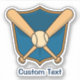 Icono de béisbol con dos murciélagos y una pelota sobre un escudo azul. Texto personalizado.