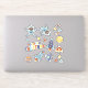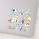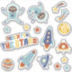 Un conjunto de pegatinas de vinilo con tema espacial para niños que incluye dos perezosos astronautas, dos cohetes, dos naves espaciales alienígenas, un planeta, una luna redonda, dos estrellas fugaces, seis estrellas coloridas y "alcanzar las estrellas" en una fuente genial en azul, rojo y amarillo.