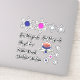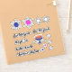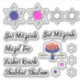 Una hermosa hoja de 15 etiquetas pegajosas. Hay 9 pegatinas de color plateado de la estrella de David: 5 son de plata lisa, 2 tienen un medio rosa brillante y 2 tienen un centro azul marino. Hay cinco plantillas de guiones circulantes con las palabras "Bar Mitzvah", "Bat Mitzvah", "Mazel Tov", "Yasher Koach y "Shabbat Shalom" respectivamente. El último pegatina es una obra de arte gráfico de nueve velas rojas brillando en una menorah con las palabras "alegre chanukah" debajo de las velas.