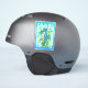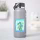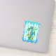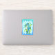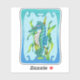 Este pegatina de vinilo tiene un dragón de caballito de mar de fantasía con cuernos azules, verdes y blancos con cuernos y su cola envuelta alrededor de algas marinas en varios tonos de verde con burbujas de agua flotante en un agua como marco ondulado en tonos azules.