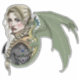 Una guerrera rubia de cabello rubio, sola, con una armadura con joyas. un pequeño dragón verde se sienta en el hombro del elfo rubio.