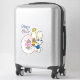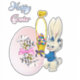 Feliz Pegatina de Pascua para las celebraciones festivas. El ilustracion tiene conejo de Pascua en azul con huevo rosa decorativo y una canasta de Pascua con polluelo. ¡Usa este pegatina para etiquetar artesanías, libros y más!