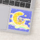 Un ratón feliz comiendo una cocina sentada sobre una luna de queso creciente, rodeado de nubes y estrellas arcoiris.