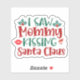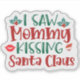 Un vibrante pegatina cuadrado trae alegría con la frase juguetona que vi a mamá besando a Santa Claus, adornada con hojas huecas festivas y un ilustracion de Papá Noel juguetón.