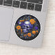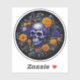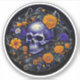 Bonito con flores naranjas y calavera. Los colores utilizados son morado, naranja y negro.