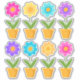 Estos preciosos pegatinas florales primaverales presentan flores de colores vivos inspiradas en la margarita, en brillantes tonos rosas, amarillos, verde azulados y violetas en macetas de flores a juego.