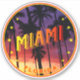 Miami Florida, Miami pegatina con puesta de sol y palmeras, en forma redondeada. Playa tropical de veraneo de Miami Beach con palmeras. Colección Ciudades de Florida