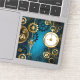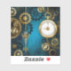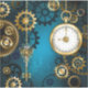fondo turquesa, texturado, de vapor punk con bronce y oro, llave de plata y reloj. Estilo Steampunk.