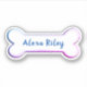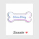 forma de hueso de perro blanco con borde arco iris y nombre. El nombre y el texto se pueden editar.