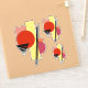 Un triángulo negro dividido en segmentos, una banda trapezoidal negra dividida en dos, un círculo rojo, un rectángulo amarillo, un cuadrado rojo pálido, un círculo violáceo y un cuadrado naranja en este arte abstracto de formas superpuestas por Richard H. Fay.