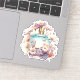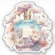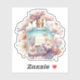 El diseño incluye una botella decorativa de perfume azul adornada con margaritas.