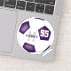 Este sencillo y deportivo pegatina de fútbol para chicas cuenta con una pelota de fútbol de estilo tradicional con paneles morados y blancos - personalizar con el nombre del jugador, número de monograma y camiseta - de katz_d_zynes