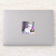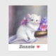Pegatina con gatito blanco. Flores rosas y violetas adornan el gatito blanco sobre una manta azul. Un regalo maravilloso para los amantes del gato y del arte victoriano.