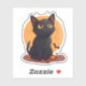 Un lindo gato negro se sienta frente a una luna llena de naranjas. Un pequeño jack-o-lantern y un maíz de dulce se sientan en el suelo a su lado, y los murciélagos negros vuelan frente a la luna. Este querido pegatina es perfecto para celebrar Halloween.