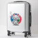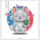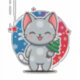 Un gato alegre sosteniendo un pequeño árbol de Navidad. Copos de nieve y estrellas cuelgan alrededor, creando una escena festiva divertida perfecta para tarjetas.