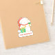 Un gato blanco sonriente en un gorra tradicional de Navidades rojos con un gran regalo envuelto le desea a todos una feliz Navidad! En su pata izquierda, el gato está sosteniendo una campana dorada con una proa verde. Personalizable.