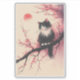 Un gato blanco y negro sereno con ojos azules llamativos encaramado en una rama de un árbol de cerezo, rodeado de flores rojas y rosas suaves. El diseño tiene una estética delicada inspirada en las acuarelas, con un toque de tinta japonesa, que evoca la tranquilidad y la belleza natural.